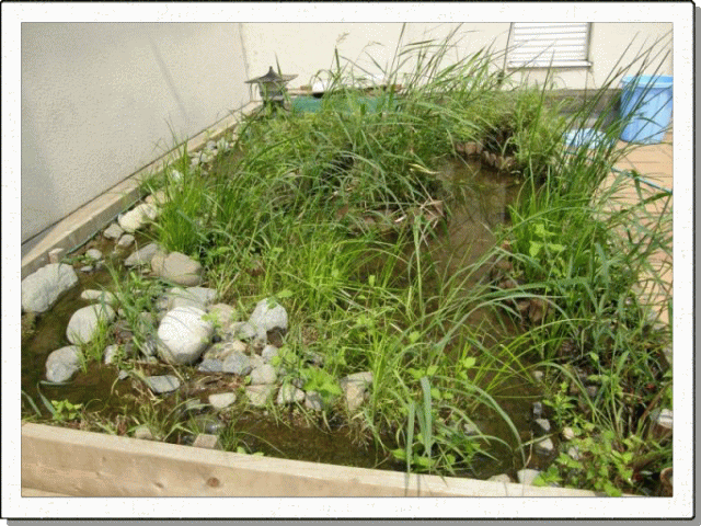 7月のビオトープです。どんなトンボが入ってくるか楽しみです。 |